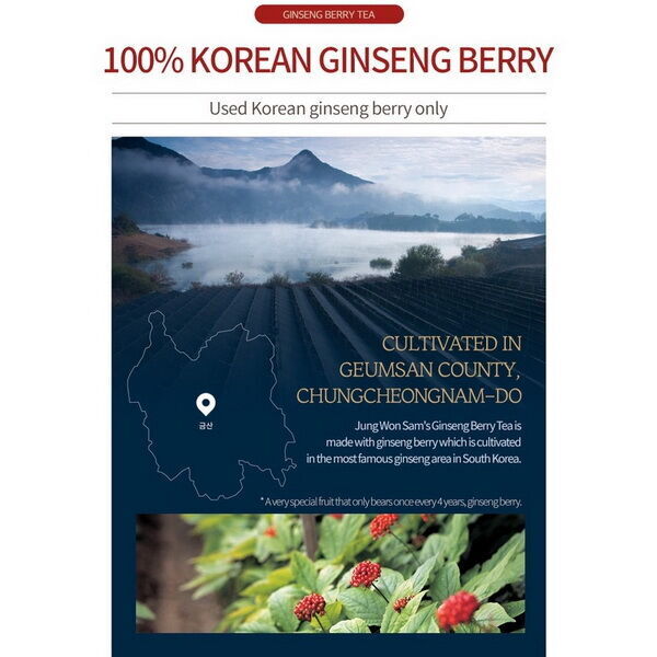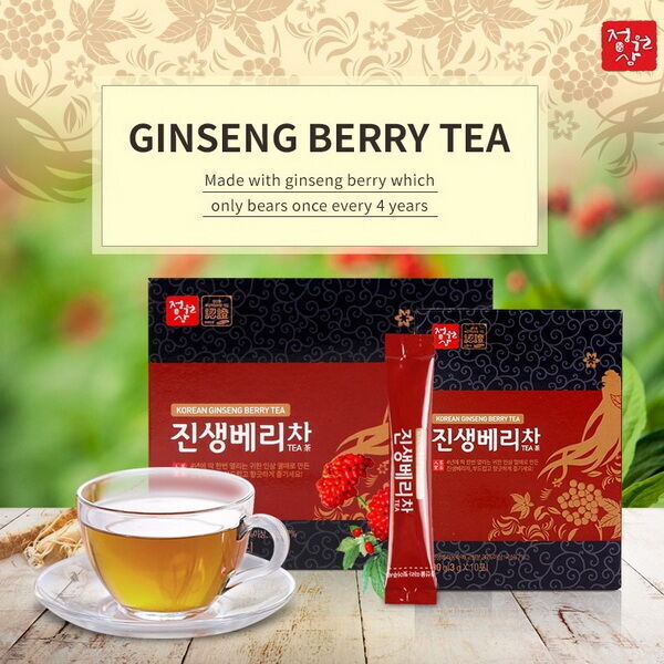 Ягода женьшеня — это драгоценная ягода, которую собирают только в течение недели в середине июля из четырехлетнего женьшеня. Известно, что по питательности ягода намного лучше корней женьшеня. Люди долгое время применяли женьшеневый чай при экземе, прыщах и других кожных заболеваниях. Современные исследования показывают употребление женьшеня может замедлить возрастную потерю коллагена, что в принципе считается нормальным для людей в возрасте 20-30 лет. Женьшеневый чай может помочь защитить организм от последствий стресса и тревоги, а также уменьшить усталость, связанную с тревогой. Исследователи предположили, что основной причиной являются его антиоксидантные свойства, действующие на молекулярном уровне. Также, он подавляет депрессию, вызванную стрессом.