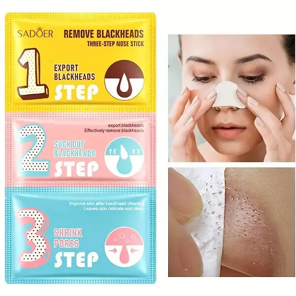 Шаг 1. Приложите к носу тёплое полотенце, чтобы расширить поры. Возьмите первую полоску, наклейте на область носа и оставьте на 10–15 минут, затем аккуратно удалите. Шаг 2. Увлажните кожу носа. Достаньте полоску для удаления чёрных точек, снимите прозрачную защитную плёнку и наклейте на нос (ровно, без смещения). Через 10–15 минут, когда полоска полностью высохнет, медленно отклейте её. Шаг 3. Используйте третью полоску: нанесите на кожу носа и оставьте на 15 минут, чтобы сузить расширенные поры.